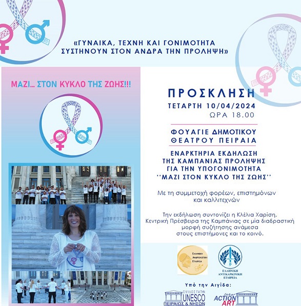 Η Πανελλαδική Καμπάνια «ΜΑΖΙ ΣΤΟΝ ΚΥΚΛΟ ΤΗΣ ΖΩΗΣ» της Ελληνικής Ανδρολογικής Εταιρίας & της Ελληνικής Αντικαρκινικής Εταιρίας υπό την αιγίδα της Επιστημονικής Εταιρίας Φοιτητών Ιατρικής Ελλάδας, της UNESCO Πειραιώς & Νήσων και την ευγενική χορηγία της Κρυογονίας και της Ενδοσκοπικής Α.Ε , ξεκινάει το ταξίδι της μέσα από την εναρκτήριά της εκδήλωση την Τετάρτη 10 Απριλίου στις 18:00 στο Δημοτικό Θέατρο Πειραιά.