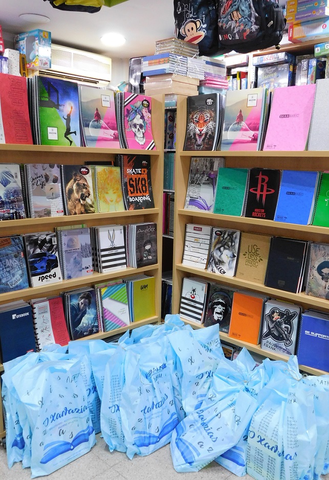 Εδώ οι μαθητές έχουν την ευκαιρία να αποκτήσουν την τσάντα της επιλογής τους με έκπτωση 10% και δυο (2) έτη εγγύηση, να δώσουν τις σχολικές τους λίστες και να τις παραλάβουν μέσα στην ημέρα, καθώς το Βιβλιοχαρτοπωλείο «Ο Χαλαζίας», αναλαμβάνει και το ντύσιμο των βιβλίων, αλλά και την παράδοση ξενόγλωσσων βιβλίων.