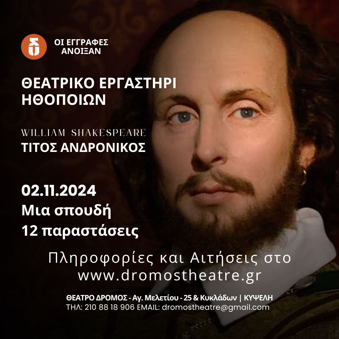 Το ΘΕΑΤΡΟ ΔΡΟΜΟΣ και η ΘΕΑΤΡΙΚΗ ΟΜΑΔΑ ΜΗΔΕΙΑ ανακοινώνουν την έναρξη εξάμηνου θεατρικού εργαστηρίου, από τον Νοέμβριο – 2024 έως τον Ιούνιο – 2025 για απόφοιτους ηθοποιούς δραματικών σχολών με θέμα τον “ΤΙΤΟ ΑΝΔΡΟΝΙΚΟ” του Ουίλιαμ Σαίξπηρ, με σκοπό την δημιουργία ενός έργου 12 παραστάσεων στον χώρο του θεάτρου ΔΡΟΜΟΣ τον ΟΚΤΏΒΡΙΟ του 2025.
