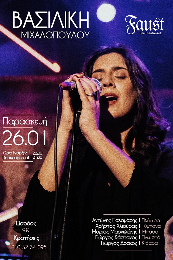 Η Βασιλική Μιχαλοπούλου μας προσκαλεί στη μουσική σκηνή του Faust, την Παρασκευή 26 Ιανουαρίου, για να μας συστήσει τα τραγούδια του νέου της album που θα κυκλοφορήσει σε λίγο καιρό, σε μουσική και στίχους του Γιώργου Καψάσκη. Η Βασιλική θα μας ξεσηκώσει με το πρώτο της προσωπικό single «Απ’ το λίγο που σε ξέρω» αλλά και θα μας ταξιδέψει σε παλιά και καινούρια αγαπημένα τραγούδια του ελληνικού και ξένου ρεπερτορίου.