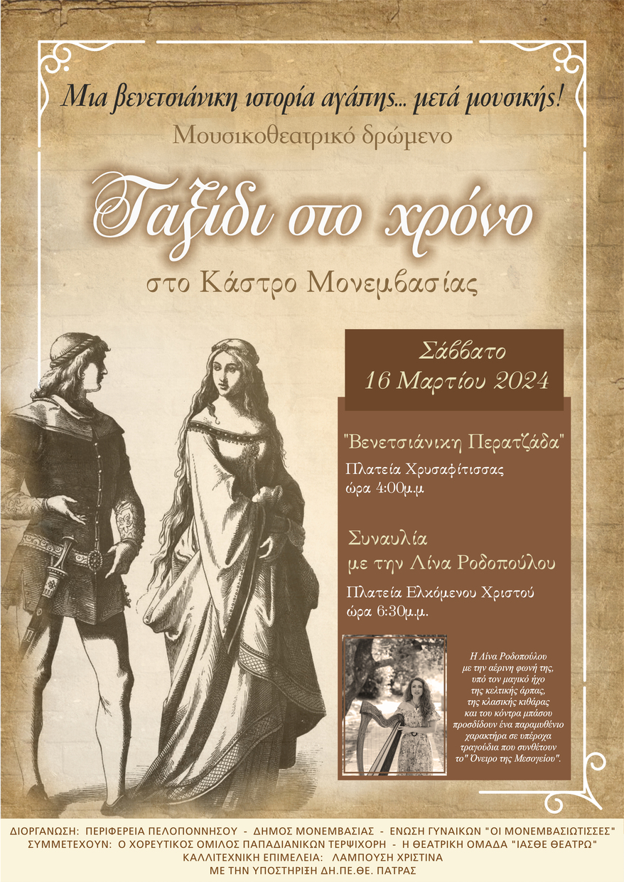 Η Λίνα Ροδοπούλου έρχεται στο κάστρο Μονεμβασιάς για μια μοναδική εμφάνιση στην Πλατεία Ελκόμενου Χριστού, το Σάββατο 16 Μαρτίου στο πλαίσιο των αποκριάτικων εκδηλώσεων του δήμου Μονεμβασιάς. Υπό τον ήχο της κέλτικης άρπας θα μας ταξιδέψει στη Μεσόγειο με τραγούδια από την Ιταλία, τη Γαλλία, την Πορτογαλία, και από την υπόλοιπη Ευρώπη. Δε θα λείψουν αγαπημένες σε όλους μας μελωδίες από κάθε γωνιά της πατρίδας μας, όπως παραδοσιακά ακούσματα, τα οποία διασκευασμένα, θα ζωντανέψουν σε μια νέα ονειρική διάσταση. Μαζί της θα βρίσκεται ο ταλαντούχος κιθαρίστας και συνθέτης, Σωτήρης Καστάνης.