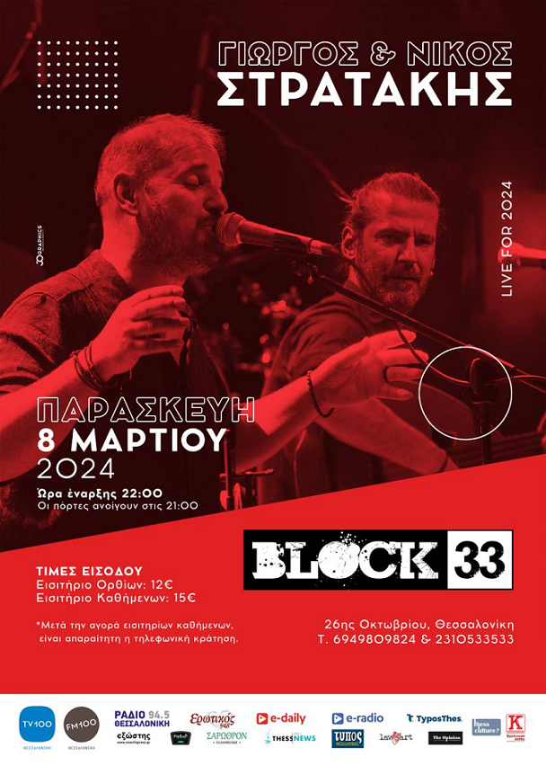 Ο Γιώργος και ο Νίκος Στρατάκης ύστερα από τις συνεχόμενες επιτυχημένες τους εμφανίσεις στο Block 33, μας ξαναπροσκαλούν για μία τελευταία φορά για φέτος την Παρασκευή 5 Απριλίου στο BLOCK33, στη Θεσσαλονίκη! Μια μουσική βραδιά που θα μας μείνει αξέχαστη!