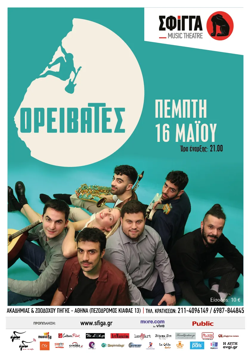 Οι επτά νέοι και γεμάτοι ενέργεια «Ορειβάτες» μας περιμένουν την Πέμπτη 16 Μαΐου στη Σφίγγα, με τον Νίκο Κιαπέκο να ερμηνεύει τόσο έντεχνα όσο και ροκ τραγούδια, πλαισιωμένος από νέους ταλαντούχους μουσικούς!