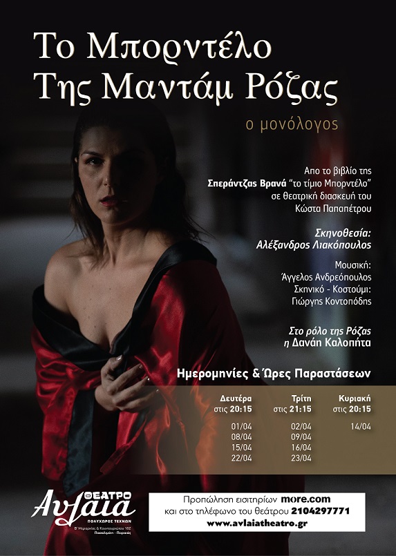 Το έργο της σπουδαίας Θεατρίνας Σπεράντζας Βρανά «Το Τίμιο Μπορντέλο», σε Θεατρική Απόδοση - Προσαρμογή του Κώστα Παπαπέτρου, Σκηνοθεσία Αλέξανδρου Λιακόπουλου και στο ρόλο της Ρόζας η Δανάη Καλοπήτα, κάνει Πρεμιέρα στο θέατρο Αυλαία την Δευτέρα 1η Απριλίου στις 20.15